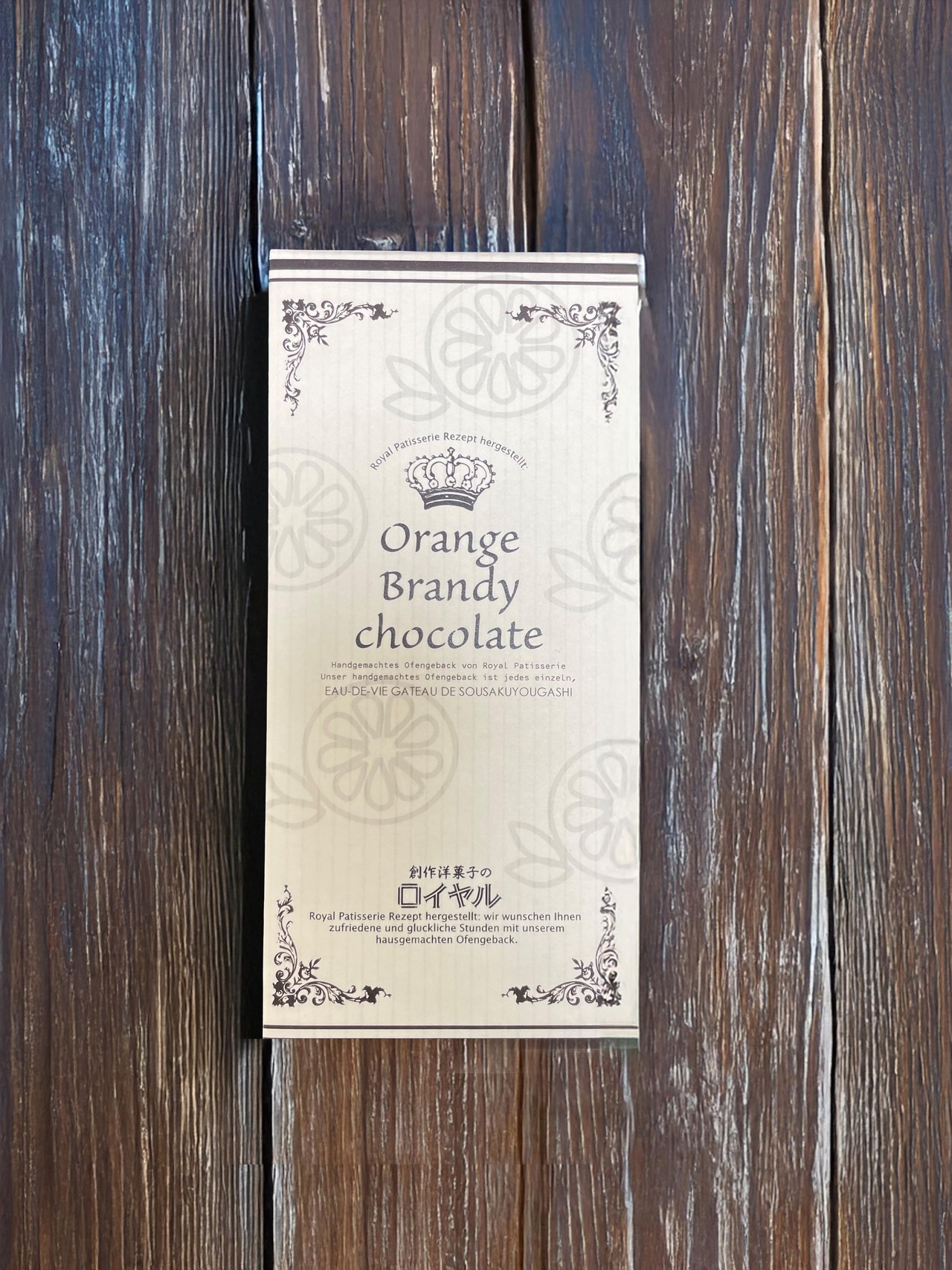 今回の新作ブランデーショコラは、以前からテーマにしたかったオレンジとショコラとブランデー、その相性の良さをいかにロイヤル風に仕上げられるかにこだわりながら創りました。何度も試作を繰り返し、オレンジの強さや、3か月の熟成後の仕上がりのイメージを想定し、お酒も何種類か試しました。吟味の結果、フランスのコニャックをベースにしたオレンジキュラソー、日本でもかなり知名度の高いグラン・マルニエを使ったオレンジピール(ペーストにしてます)入りのブランデーショコラとなりました。その名も「オレンジブランデーショコラ」、シンプルすぎる名前です。皆様の想像を超えるものに仕上がっていることを願いながらの発売開始です。
